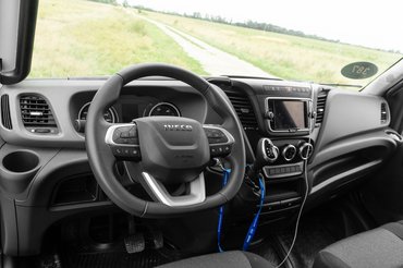 A fejegység a Jeepekből is ismerős rendszer volt, Tomtom navigációval, viszont annak teherautós változatával. Így teher-módban meg lehet adni a méreteket, súlyt és ADR adatokat, és útvonaltervezésnél ezt figyelembe veszi. Mivel 5 tonna alatti tömeget nem lehetett megadni, így menet közben párszor szólt, hogy tiltott útvonalon haladok. Nem mellesleg ekkor a sebességlimitet se lehet 100 km/h fölé emelni. Az autó rendelkezett tolatókamerával, ami menet közben is kapcsolható, így tükörként is használható. Az oldalsó tükrökre sem volt panasz, igaz, az alsó elem nem mozgatható, de így is jól be lehetett látni a kocsi mögötti, melletti területet.
