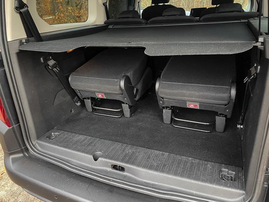 A lényeg persze ebben a kocsiban úgyis az, hogy hogyan lehet benne heten elférni. Előzetes terveimmel ellentétben nem tudtam összetrombitálni ennyi embert, akik mind egyszerre ültek volna benne, úgyhogy kénytelen voltam egyedül végigpróbálgatni a székeket. A második üléssor azt adja, amit ránézésre is ígér: kellemesen nagy lábtér, három embernek pedig az átlagnál jobb tér széltében, hiszen maga az autó is szélesebb a szokásosnál. Az igazi izgalmakat persze a két hátsó ülés ígérte, amelyek alapállapotban a csomagteret takaró roló alatt összehajtva pihennek. Ez egyben azt is jelenti, hogy ilyenkor nem érdemes nagy pakolásokról ábrándozni, hiszen az ülések vannak ott. Felhajtva derül csak ki, hogy ezek már majdnem teljes értékű székek: egész magasak, így nem kell állig húzott térdekkel kuporogni, és a második sor székeit előrehajtva a beszálláshoz sem kell kínai akrobatának lenni. Egyébként teljesen fel is lehet csukni őket a második üléssornak támasztva, ilyenkor a csomagtér mélységéből persze veszítünk, de ha magasabb tárgyakat akarunk szállítani állítva, akkor jól jöhet ez a tudománya. És persze ha tényleg tele akarjuk pakolni a háznyi méretű csomagteret, akkor ki is lehet venni az egészet a fenébe.