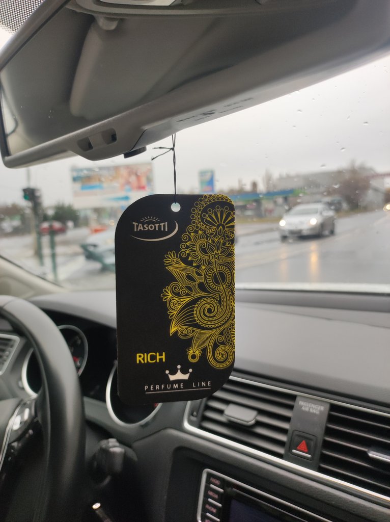 Első alanyom a neve és külleme ellenére meglepően szolid, kellemes illatú, tükörre lógatós parfümös illatosító. Az a benyomásom támad, hogy egy vasalt fehér inges középvezető ül mellettem egész nap, pedig valami kamuarmanival telelocsolt fukszos figura fantomtársaságára számítottam a név alapján. Enyhe, diszkrét férfiparfüm, közepesen érezni, de azért a tükrön himbálózó aranyozott "Rich" felirat által keltett imázst valószínűleg kevesen szeretnénk otthonra. Akkor lehet jó, ha valaki hasonlót használ magára is, és valami ezzel harmonizáló szagot szeretne a kocsijába, de akkor azért próbálja meg valahogy betűrni a tükör mögé.