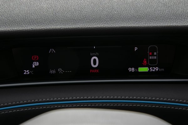A kijelzőn alul és felül hagytak egy-egy sávot, az alsón állandóan ott lesz a klímavezérlés, az ülésfűtés és egy home gomb, felül pedig az időt, a külső hőmérsékletet és néhány kedvenc menüpontot látjuk majd folyamatosan. A kijelző nagy részére jellemzően a térképet vagy az okostelefon-integrációt (Android Auto, Apple CarPlay) érdemes kirakni, mellette néhány apróság is elfér, akár egy zenevezérlés, akár töltési állapot, akár fogyasztás-infók.