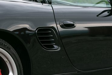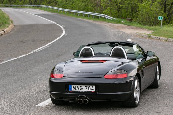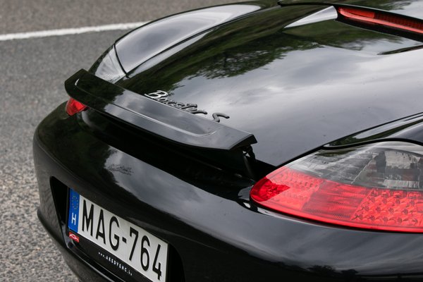 Egy ekkora piacra a Porsche is be akart törni, és bár nyilván árban ezekkel nem akart versenyezni, de egy, a 911-nél lényegesen olcsóbb, középmotoros sportautó lett belőle. 1993-ban már volt egy koncepció az első, nem-orrmotoros, de vízhűtéses Porschéből, 1996-ra pedig már gyártásba is került. A Kedvenc kereskedésből elhozott példány már a facelift utáni, 2003-as Boxster S a legerősebb, 3,2-es motorral, de Tiptronic automata váltóval. Kézi váltósként népszerűbb és keresettebb a típus, ami nem véletlen, cserébe viszont ez egy Black Edition, ami nemcsak a fekete külsőt és fekete bőrbelsőt takarja, hanem az ezüst beltéri díszbetéteket is.