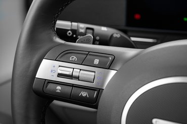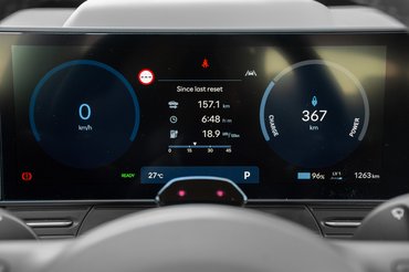 Van vaskos irányváltó kar és kissé túlméretezett, cserébe váratlanul könnyű, Hyundai emblémát mintázó kulcs is. Normál üzemmódban mértéktartó a gyorsulása, Sportban már szívesen az ülésbe lapít a Kona, és ha kanyarban sem vesszük el, kiderül, hogy közepesen kényelmes hangolású futóműve milyen stabilan ragaszkodik az úthoz. Fékezésnél persze feltűnő a nagy tömeg, felkészítették rá, de nekünk is érdemes számolni vele! A vezetési idő nem volt elég a hatótáv feszegetésére, annyi baj legyen, majd itthon visszatérünk rá.