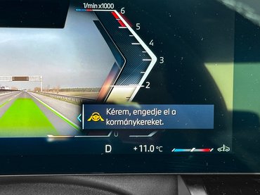 A kormányt viszont fogni kell rendesen, mert elég agresszíven fogatja veled a sávtartó. Kamerával figyel, nem kormányerőre reagál, és körülbelül 10-20 másodperc után már narancssárgán figyelmeztet, néhány másodperccel később pedig azonnali beavatkozást kér, különben azt hiszi, rosszul vagy, és megáll. Itt viszont becsúszik az autó legkellemetlenebb fordítási hibája: amikor csak értesít, hogy fogd meg a kormányt, pont az ellenkezőjét írja: Kérem, engedje el a kormányt! Na, ilyenkor ne engedd el, hanem tényleg fogd meg, tapasztalat.