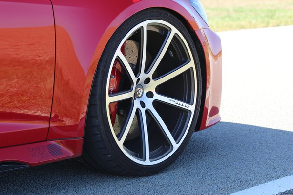 A teljesítmény extrém növelésének eszközei szinte láthatatlanok maradtak, az ugyanis elsősorban a két finomított és átdolgozott turbófeltöltőnek köszönhető: nagyobb turbinatengelyek és méretesebb kompresszorkerekek, valamint megerősített axiális csapággyal és megnövelt turbófeltöltő nyomással dolgoztak a srácok. Módosították a töltőnyomás érzékelőket, nagyobb átmérőjűek a szívótömlők és a légszűrő doboz is. Szóval a géptér optikailag olyan maradt, mint a sorozatban készülőé, kivéve a karbon fedelet. Ehhez tesz még hozzá a módosított szívó- és a nagyobb térfogatú kipufogórendszer. A váltó esetében a nagyobb teljesítményhez hangolták a szoftvert, az alsó fokozatokban a kapcsolási fordulatszám 7100 fordulat/perc, a startautomatika pedig 2900-as percenkénti fordulatszámról indítja a kilövést. A maximálisan elérhető 1250 newtonmétert elektronikusan korlátozták – biztos, ami biztos alapon. Hogy megértsük, mennyire brutális adatok ezek, ismétlésképp: a bika erős széria RS6-os 600 lóerőt és maximum 800 newtonmétert tud, a performance ugye 630-at és 850-et.