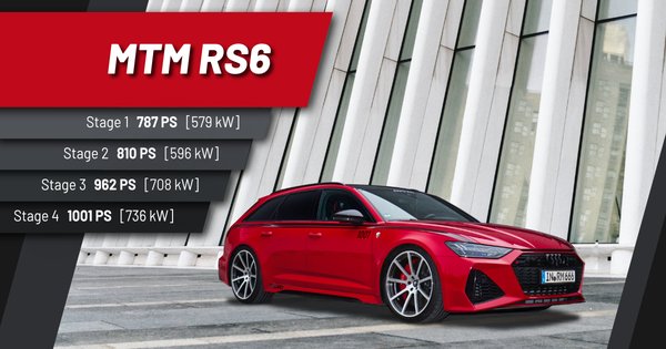 A teljesítmény növelése az RS6 esetében több szakaszban lehetséges az MTM-nél. Ha csak a vezérlés-elektronikával mókolnak, felhúzzák a teljesítményt 722 lóerőre és 950 Nm-re – ez nagyságrendileg ötezer euró. A 787 LE / 1030 Nm-es kicsivel több mint duplaennyibe kerül, ennél már a motor légellátásába is belepiszkálnak, karbon rendszer kerül be. A 810 LE / 1060 Nm-es Stage2-höz módosított kipufogórendszer is jár, a számla 16,5 ezerről szól. A 3-as 962 LE / 1250 Nm-es végeredményt hoz közel 30 ezerért, itt az előzőeken túl a turbófeltöltők is mások. S aki mindezekkel elégedetlen, s a VIP csomagra fizet be – ahol a mozaikszó nem különleges személyt jelent, hanem extrém teljesítményt, még ha ilyen kifejezés az angolban valójában nincs is – Very Incredible Power-t, vagyis hihetetlen motorteljesítményt kap: 1001 lóerő s 1250 Nm!