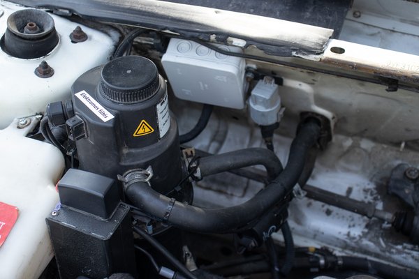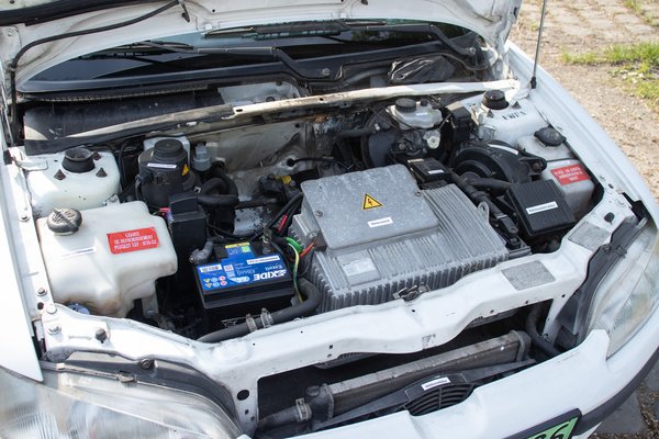 A motortér különös, a tűzfal előtt nagy lyuk tátong, ahol az eredeti akkumulátor egyik fele kapott helyet. A csomag másik része a csomagtérpadló alatt volt, így a 106 amúgy sem bőséges rakterét kicsit még összébb húzták. Viszont amikor bekerült a Hyundai féle lítiumos akkumulátor, akkor csak a hátsó üregre volt szükség, így a motortér most kissé levegős. Csak a masszív méretű inverter erősíti a nem megszokott látványt, illetve saját hűtőkört kapott tágulási tartállyal. A villanymotor még ennyi törődést sem érdemel, neki egy levegőhűtéses rendszert alakítottak ki a francia mérnökök.