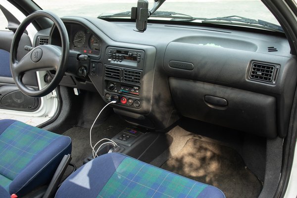 A tesztelt 106-os 2028-ban lesz 30 éves, tehát OT-érett. Addig még lesz vele meló, de legalább a beltér nagyon jó állapotban van. Kifejezetten tetszenek a kék kockás ülések és a középkonzol, melyről lemaradt a váltóbot. Ez szintén egy nagyon intelligens része a 106 Electricnek, mert a ma is használt D, tehát Drive mód a gyujtás ráadása után következik. Nincs dedikált gomb, se kar, se tekerő, indítás után az autó azonnal előre megy – nem hátra.