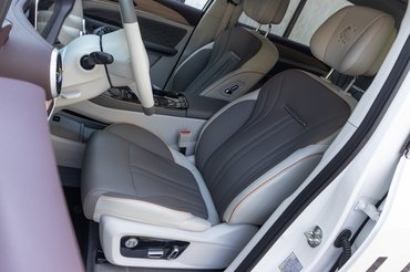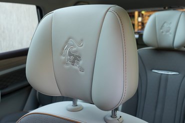 Nem is ez a lényeg a beltérben, sokkal inkább az ülések. Az elrendezés nem a megszokott, mert leghátra került három ülés, nem pedig középre – ott csak kettő van, viszont azok fullosak. Van bennük elektromosan állítható ülőlap és háttámla, ülésfűtés és -hűtés, illetve saját karfa és USB-A portok. Kis érdekesség, hogy nemcsak előre-hátra, de jobbra-balra is mozognak a középső sor foteljei, és akár napággyá is alakíthatjuk őket. Ha a két első ülés fejtámláját kivesszük, vízszintbe fektetjük őket és hátraengedjük a második üléssort, akkor két napágyat ad ki az autó, akár aludni is lehet benne, vagy a panoráma üvegtetőn keresztül élvezni a csillagokat éjszaka. A hangulatot a fahatású burkolatokban megjelenő absztrakt mintázat fokozza, aminek állítható a LED-es háttérvilágítása.