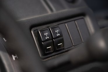 A műszerfalon főleg a két középső gomb volt lényeges elem. Az egyik a hátsó diffizárat, a másik az összkerékhajtást kapcsolja. Ebben még nincs modern, elektronikusan szabályzott kuplungos rendszer: csak üresben, álló helyzetben szabad ezeket rákapcsolni. Ráadásul aszfaltra sem érdemes kimenni, ha a rendszer zárt, mert középen nincs diffi, az első és a hátsó tengely fordulatkülönbsége miatt kanyarban ropognának a féltengelyek és a gumi is gyorsabban kopna.
