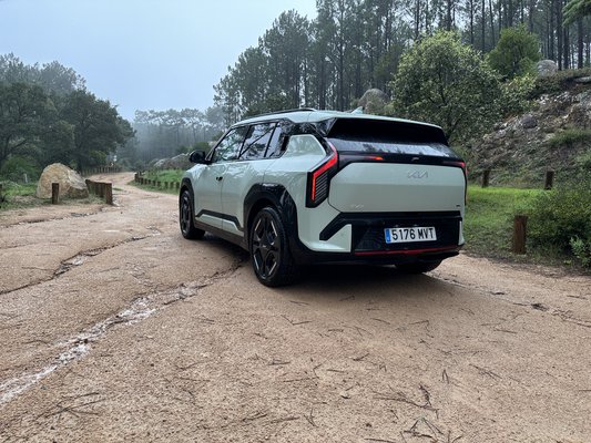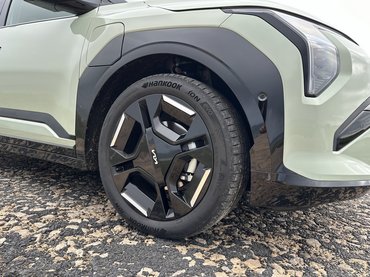 Van egy kisebb, 58,3 kWh-s akkumulátor is a spórolás jegyében, azzal 14,7 millió forintról indul az EV3, de úgy gondolom, hogy a nagyobb jobban megéri. 16,6 millióról indul, így kevesebb mint kétmillió a felára annak a megdöbbentő technikai húzásnak, hogy egy ilyen kicsi autó alá, ekkora akkumulátort faragtak – de hát az E-GMP platform engedte. Ezzel kapcsolatban egyébként érdekes, hogy az EV3 elsőkerék-hajtású, a vizes szerpentinen vért izzadt a kipörgésgátló, hogy megfogja az állandóan elkaparó ívbelső kereket. Mégsem ezért örültem volna jobban egy hátsókerék hajtásnak, sokkal inkább a fordulókör miatt. Ha elöl nincsenek gömbcsuklók, semmi sem korlátozza a kormányszöget, így addig fordulnak az első kerekek, amíg a kormánymű bírja.