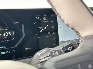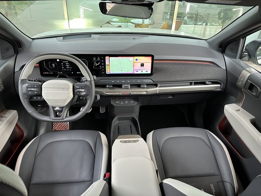 A forma miatt egyébként ez egy nagy-kis-nagy autó. A magasra húzott élek, letisztult felületek és a crossoveres építés miatt nagy autónak hat, de közelről azért elmúlik az érzés. Alig 4,3 méter hosszú, 2,68 méter a tengelytáv - mint egy VIII-as Golfnak - aztán beül az ember, és ismét nagy autónak tűnik az EV3. Messze van a fejemtől a tető, a tűzfalat sem érem el a lábaimmal, az ülés pedig széles tartományban állítható. Aztán ott a hátrahúzott, szolid műszerfal, ami alig vesz el az értékes légtérből. Semmilyen irányba nem terjeszkedik túl, mégis elfért rajta néhány hasznos, fizikai kezelőszerv, illetve két 12,3 colos kijelző összehúzva egy nagy táblába.