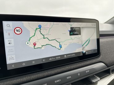 Manapság ez a divat, egyre több autóban így tudják le a fedélzeti rendszer és a műszercsoport kérdéskörét, a Kia viszont elrejtett itt még egy panelt. A két tábla közé szorított egy néhánycolos kijelzőcskét, ez dedikáltan a hűtést-fűtést hivatott működtetni. A kormány karimája ezt normál esetben kitakarja, hajlamos vagyok megfeledkezni róla vezetés közben, de ahogy nekiállok keresni a kívánt funkciókat, a szemem mindenképpen beleakad. Az ülés dolgait (állítás, fűtés, hűtés) szerencsére nem ide sűrítették össze, azok az ajtón ívelő, fémhatású díszelemre kerültek.