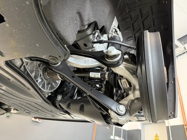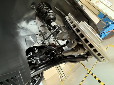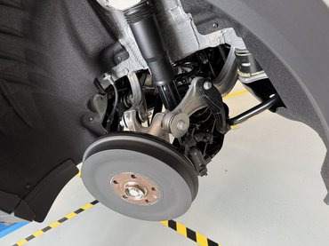 Mechanikai szinten a mérnökök minden tőlük telhetőt megtettek. Eleve jó volt a kiindulási alap, hiszen az elektromos autós felépítés velejárója a padló a rejtett 84 kWh-s (nettó 79 kWh) akkumulátor, ami alacsony súlypontot jelent – még egy SUV esetében is. A másik előnyös megoldás az igényes futómű: elöl klasszikus MacPherson, hátul pedig oldalanként 5-5 lengőkaros Multilink rendszert alkalmaztak. A stabilabb futás érdekében több ponton megerősítették és 15 milliméterrel lejjebb engedték a kasznit, illetve adaptív csillapítással előzték meg a koordinálatlan billegést. Ez utóbbi egyébként sikerült: nemcsak nem ér le kanyarban a kilincs, az autó letalpalt daru módjára tartja magát, amíg pofátlanul közbe nem avatkozik a fizika.