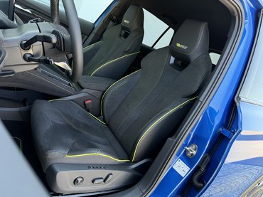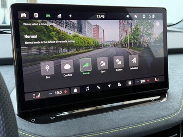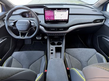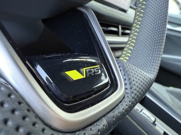 Az RS specifikus sportülések kényelmesek, szellőznek és kiváló rajtuk az anyaghasználat, viszont hiába süt róluk a jó oldaltartás, én flipper golyóként vágódtam jobbra-balra. A dizájn magáért beszél, az egész beltér prémium érzetet kelt a rengeteg alcantara bőr hatású huzat miatt. A rikító sárga varrás, a kormány aljába rejtett apró VRS logó és a bőr huzat magukra terelik a figyelmet, de érdemben nem választják el az RS belterét egy sima Elroq-étól. Érdekes módon kívülről sem árasztottak el az autót sportos jegyekkel, csak a tükrök alatti fekete idomokba került oldalnként egy VRS logó. Ennyi. Se az autó hátulján, sem a hűtőmaszkot imitáló – egyébként tömör, fényes műanyag – idomban nem jelenik meg, hogy ez egy sportváltozat.