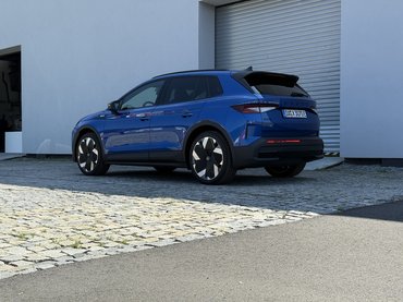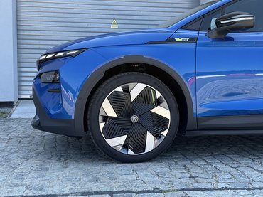 Már-már sleeperről is beszélhetnék ha nem nyúltak volna olyan jótékonyan az első-hátsó lökhárítókhoz, a küszöbökhöz és a kerekekhez. Az Elroq RS bődületesen nagy 20 és 21 colos felniket kínál – utóbbit jó peres abroncsokkal – amik bár alumíniumból készülnek, ebből keveset látni a műanyag aero idomok miatt. Éppen ezért a fékek sem világítanak a felnik alatt, pedig nagyon szerettem régen a Skoda sötétzöldre festett RS nyergeit. Talán azért sem akartak világító fékeket, mert az Elroq-nak még az RS változata alatt is dobfék van hátul. A mérnökök szerint azért nincs szükség ennél komolyabb megoldásra, mert a villanymotorok ellenállása gyakran elég.