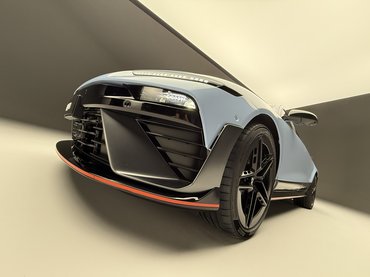 Az autó orra nagyon durva, már-már modernebb Lamborghinik elejére emlékeztet a hűtőlamellák és terelőlemezek együttese, de nagyban rájátszanak a fényezéssel. Ahogy az N-kék felső rész ráfolyik a fekete alapokra – amiket alulról egy piros csík választ el az utca porától – az drasztikusan megemeli az autó orrát. Azt hinnénk, hogy csak úgy dől bele a rengeteg hűtőlevegő, valójában a nyílások jelentős százaléka vak, hiszen az elektromos rendszernek nincs olyan hőterhelése, mint egy combosabb belső égésű motornak. Azonban dizájnban ezt szoktuk meg, ezt gondoljuk agresszívnek, vagánynak és végeredményben működik.
