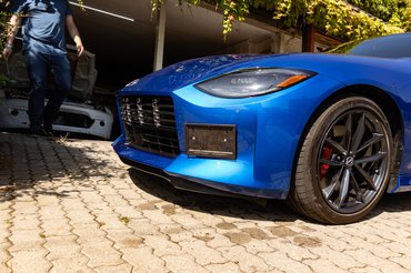 Ezzel kapcsolatban érdekes, hogy a Nissan is abba a hibába esett, mint anno az Alfa Romeo jónéhány modelljénél: klasszikus módon középre nem fér rendszámtábla, muszáj eltolni kicsit oldalra. A szívem szorult volna össze, ha meg kell fúrnom a lökhárító bal elejét, de a tulaj erős volt, megtette, és így a hatóságok sem piszkálják. Az ausztrál piacos Z-k hűtőmaszkján van egy konzol, de állítólag hűtési szempontból nem hatékony.