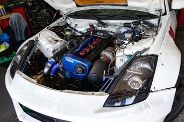 Ő egyébként nem kezdő Z-tulaj, ez már sokadik autója a szériából, de ez az első, ami új. Iskolába már egy 200SX-szel járt, később pedig egy 350Z-vel jelent meg a drift orientált pályanapokon, majd amikor már az is szűk volt, jöhetett a versenyzés. Bár impozáns volt a kék Z a garázsok előtt, a nyitott roló mögött álló 350-ekre is rá kellett kérdeznem, egy ilyen izgalmas hely mellett nem tudok csak úgy elmenni. A fehér autó egy becsövezett versenygép, gyönyörű eloxált kék futóműelemekkel, masszív gátlókkal, döbbenetes kormányszöggel és egy csupasz, mégis erőtől duzzadó motortérrel. Az RB26 a japán autók kedvelőinek sokat mond, bizonyos körökben a Nissan 2JZ-jének hívják, bár alap állapotában nem olyan masszív és jól tuningolható.
