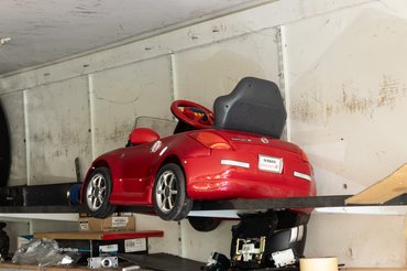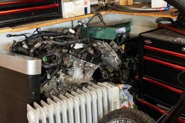 A beltér finom, a kék kárpit pedig jó döntés volt, illik az autóhoz. Ízlésesen behúzták vele az ajtópaneleket, az üléseket és a középkonzol egy részét, a maradék felületen a fekete műanyag dominál. Impozáns az ülések mögött nyújtózó masszív, alumínium merevítő elem, illetve van egy hasonló a motortérben is, bár az egyfelől állítható, másfelől acél. Sajnos itt ez a fő látnivaló, a Nissan és a V6 Twin Turbo feliratos burkolatot is leszorítja, így nem látni be a 60 fokos szögben álló hengerek közé – kár. Bár az utóbbi időben csövek, vezetékek és buflák csatlakozók tömkelege alatt ritkán látni csupasz fém tömböket, így egyelőre a Z alumínium blokkját és hengerfejeit is csak képen láttam. Kárpótlásul a tulaj odébb tett néhány kempingasztalt, villanyradiátort és abroncsot a garázsában, csak előkerült három VQ35-ös blokk többé-kevésbé harcra kész állapotban.