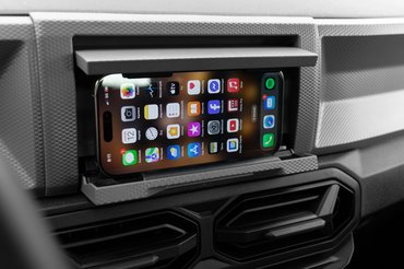A jobban felszerelt változatokban ilyen régimódi elem nincs, ott a klímapanel felkerül egy gombsorra egy 10,1 colos érintőkijelző alá. Az alap Dusterben azonban ilyen úri huncutságoknak nem jutott hely: nem csak a végtelen, vakgombsor látványos, de a táblagép hiánya is, ami ma már szokatlan. Feltételezik, hogy mindenki zsebében ott lapul az okostelefon, így a fedélzeti számítógép legfontosabb funkcióit az óracsoport apró, folyadékristályos kijelzőjére adaptálták, középre pedig csak egy masszív telefontartó került. Rugalmas és stabil, ami fontos tulajdonság, hiszen ma már egy kisebb használtautó árát költik emberek telefonra.