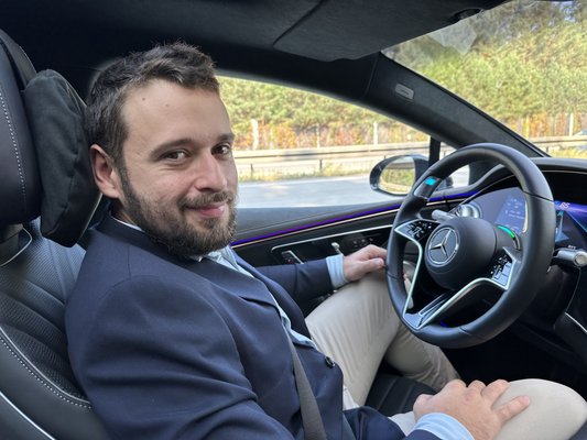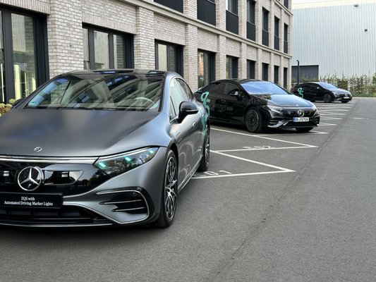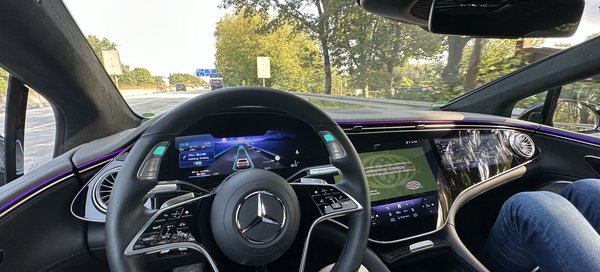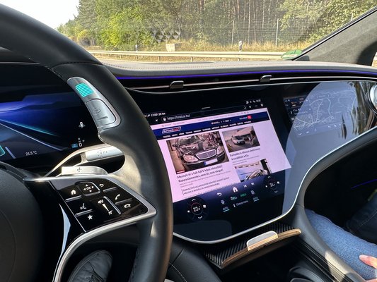 Már kora délután is erős a forgalom a berlini autópálya-körgyűrűn, de az EQS volánja mögött, néma csendben lebegve ez igazából nem zavar. Két mérnökkel a fedélzeten épp az egyik korabeli határátkelőt meglátva kezdünk bele történelmi témákba, de a kormányon két türkizkék led felvillanása jelzi, hogy erre most nincs idő, múlt helyett a jövőt fogom másodperceken belül átélni, egy gombnyomásra vagyok attól, hogy az autó magától vezessen.