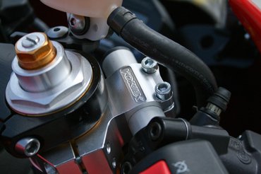 A villaszög, meg a motor farának felemelése már igényel egy jobb fajta kormányteleszkópot, tesztmotorunkon Öhlins volt. Sajnos pont annyi üzemóra volt benne, hogy a hétvége után vitték szervizelni, ezért azokon a kigyorsításokon, ahol göröngyös volt a beton, elég szépen szteppelt a kezemben a kormány. A motor fenekét én még magasabbra emelném. Akkor kisebb lenne a kerekezési hajlam, még precízebb a bekormányzás - szervizelt kormánytelóval nem is lenne felesleges izgalom a kanyarból kifelé.