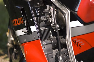 Az SACS felirat Suzuki Advenced Cooling Systemet jelent, ez magyarra fordítva nem más, mint a kombinált levegő-olajhűtés. A gép erejéhez a léghűtés kevés lett volna, a vizes köpeny meg nehéz: a forradalmian sűrű hűtőbordákat választották. Ma már senkit sem ver mellbe 106 lóerő említése, de 1987-ben, a H-szériás gyártásakor izgalmasabbnak számított, mint a legendás, százszemélyes, német gruppenek. Lóerő-tömeg arány kiváló, 181 kilója ma is tisztességes. Amiben lemarad az öregnek álcázott 210 kilós GS 1200 SS-től, az a váz és a futómű.