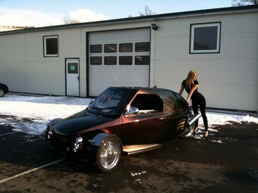 A technika persze jóval korszerűbb: vászon helyett szálerősítésű műanyagból készül a karosszéria, a vázszerkezet a sportkocsiknál is használt csővázas kialakítású, az utasokat pedig versenyautókra jellemző kagylóülések várják. Ráadásul a prototípus ajtói is előre-felfelé nyílnak, akárcsak egy Lamborghinin. A stabilitás megtartása érdekében a jármű igen széles első futóművet kapott, így a 3,8 méter hosszhoz és az 1,37 méteres magassághoz 1,9 méteres szélesség társul. Az egyetlen már megépült példány, amely a 00-s sorozatszámot kapta, persze nem eladó: a gyártó cég tulajdonosa jár majd vele, ennek megfelelően igazán gazdag felszereltségű, és egy tuningolt, 1300 köbcentiméteres Honda CB motor hajtja.