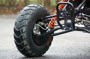 A felesleges vértől az olyan klasszikus quados kellékek is védenek, mint az alumínium lábtartórendszer és a hozzá erősített erős háló. Így véletlenül sem tudjuk letenni a lábunkat – jobb is, a bütykös gumi csúnya pusztítást vinne végbe.