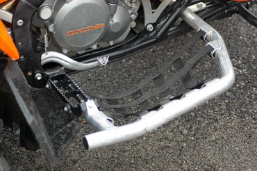 A nyereg mögé is került az aluból: a masszív kapaszkodó praktikus, segítségével könnyen odébb tehetjük a KTM fenekét. Nem nehéz, 168 kilós tömege nem okozhat gondot az edzett férfikarnak. Úgy érzi, hogy az öné nem elég izmos? Ne aggódjon, ha elkezd quadozni és gyakran lejár a terepre, pompásan kigyúrja magát. Ami igaz az enduróra, igaz erre is; a különbség, hogy itt az utcai haladáshoz sem árt a férfias erő.