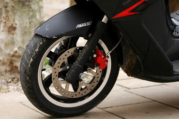 A fekete motorhoz jól illenek a piros elemek: a fék, az ülés varrása, a matrica és a K betű a felniben. Nem csak a takony cukrozása a sok sportos apróság, ez tényleg jól megy, nyoma sincs a gyári robogók álmatagságának. Igaz, az ötvenezres kötelező szerviz nem biztos, hogy a legolcsóbb lesz, de ez tényleg nem mindennapi technika.