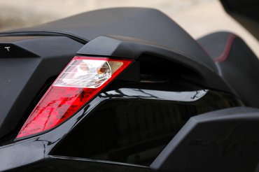 A tesztmotort ellátták az összes létező extrával. A füstüveg plexi illik a géphez, vagy legalábbis nem ront rajta. A titán, kipufogóra szerelt hővédő kedves semmiség, a nyereg alá tekert Abus lakat viszont kifejezetten praktikus. Ügyesen képezték ki a helyét, nem mozog, nem verődik. A rakodótérben még 12V aljzat is akadt – telefon, netbook töltődhettek.