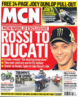 Hivatalos bejelentés még egyáltalán nincs, azonban az MCN angol szaklap tényként hozza le hasábjain, mi több, címlapján: Rossi aláírt a Ducatihoz. A britek nem nagyon szoktak viccelni, feltevésüket a világbajnokság legmélyebb bugyraiba is belelátó bennfentesekkel igazolják. Valentino Rossi versenyeztetésének természetesen vannak kisebb-nagyobb anyagi vonzatai: a kontraktus állítólag 15 millió euróról szól. A pletykák szerint a Fiat szívesen együtt mozdulna a Doktorral, ami közvetve megmentheti a Ducati Superbike világbajnokságon induló gyári csapatát: ha a Marlborónak kell kitermelnie a pénzt, a szebb napokat látott Xerox Ducati megszűnhet létezni.