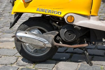 A karcok és a rozsdás krómozás is alátámasztották származási elméletemet. Tipikusan a konténerben behozott, Japánban már leharcolt robogók szoktak így kinézni, amelyeknek még egy esélyt ad a költséghatékony magyar nepper. Az Amerigo felirat sem árult el semmit: aki képes eligazodni az utóbbi hatvan év robogótípusai között, autista. Még márkajel sem volt, saccolhattuk bárminek, hisz körvonalai megegyeznek bármely Vinóval, Honda Giornóval vagy Suzuki Verdével.