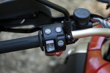 Az ABS és a kipörgésgátló is a markolatról babrálható. Ezekre terepezéskor szükség is lehet – az offroad haladáshoz tovább állítható az előfeszítés; ennek külön ikonja van a kijelzőn. Ugyan a GS szériagumival nem való még fűbe sem, de abroncscsere után már bátran ki lehet motorozni a világból – a típus szerelmesei harminc éve ezt teszik. Terep és utcai módhoz egyaránt háromféle előfeszítést kínálnak, a különbség valóban érezhető és akár menet közben is változtathatunk az ESA segítségével.