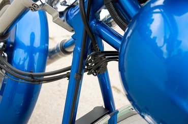 Magas nyak, mélyre húzott első ülés, puncipárna hátul, vékony első, masszív hátsó kerék, a váz csúcsára biggyesztett, jelzésértékű, nyújtott tank, letisztított, minimalista technika, sok-sok króm, lenyűgözés, áhítat, sebmérő á la Corbusier. Aki ezen ül, nem átlagember. Legalábbis amíg sok nem lesz belőle az utakon.