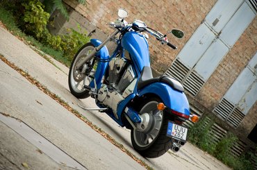 Pedig a motor gyönyörűen, puhán jár. Meglepő, de 120-ig abszolút tűrhető a szél nyomása. A váltó hosszú úton, óriásikat csattanva kapcsol – tehát megvan a harley-s idessüss-hang a pirosnál – viszont Honda, tehát precíz, kis erő kell a működtetéséhez. Kipufogómorajt persze szűken mértek a japáni konyhás nénik, hiszen ők is ismerik az emissziós normákat, de ami van, az szorgos, rotyogós, motorféken kellemesen recegős. Persze nincs meg benne az a sántítás, mint a Harley-knál, hiszen az ilyen műszaki hibának minősül a Honda kelléktárában, de cseppet sem rossz. De minek is beszélek itt hangról – szerintem Magyarországon száz százalék körül lesz azoknak az aránya, akiknek ezzel a géppel az első útjuk a kipufogóshoz vezet a kereskedésből... Hogy miért nem találja már fel a Honda a műanyag, eldobható kipufogóval szerelt custom gépet a kelet-európai piacokra?