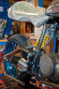 Tényleg partizánharc: szerszámok, fémreszelék, számítógépek és tervrajzok között ülünk. A munkaasztalokon különböző motorok, különböző fázisban. Lézerre vágott alkatrészek várnak beépítésre: rendszámtáblatartók, kipufogótrombiták, és tartókonzolok.