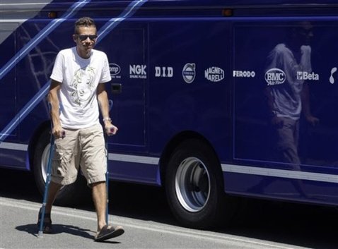 Valentino Rossi az idei évben kétszer is megsérült. Először hobbimotorozás közben érte utol a balszerencse a szezonnyitó Katari futam után – ekkor sérült meg válla, ami mind a mai napig nem gyógyult meg. Másik nagy bukása a mugellói hétvége egyik edzésén történt, amikor kettős lábtörést szenvedett – azonnal megoperálták, hónapokat kellett kihagynia, de a legutóbbi futamokon már nem jelentkezett lábfájdalma.