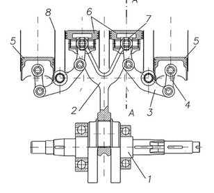A kéthengeres 900SS főtengelye változtatás nélkül alkalmas a V8-hoz. Meglepően hangzik, a képen is látható a szabadalom lényege: a négy hengerhez csupán egy hajtókar kell. A kis nyolchengeres hengerűrtartalma 868 köbcenti, a furat-löket aránya 56×44 milliméter.