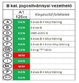 Magyar Gépjárműimportőrök Egyesületének múlt heti tájékoztatóján elhangzott: szorgalmazzák, hogy „érett” B kategóriás jogosítvánnyal, gyakorlati oktatás után legyenek használhatóak a 125 köbcentis motorok. Portugáliát hozták fel példának, ahol a közelmúltban bevezették ezt a módszert. A 125-ös motorok forgalma megnégyszereződött, a robogóké meghatszorozódott.