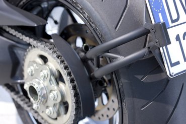 A futóműtől sem kell félni: elöl brutális, 50 mm belsőcső-átmérőjű, fordított Marzocchi teleszkópok dolgoznak, amiknek az aljára monoblock Brembo féknyergeket szereltek – a féktárcsák átmérője 320 mm. Hátul vízszintesen elhelyezett, mindenhogyan állítható Sach rugóstagot találunk.