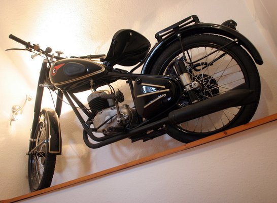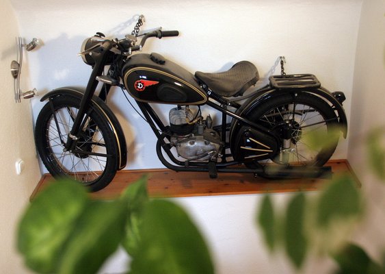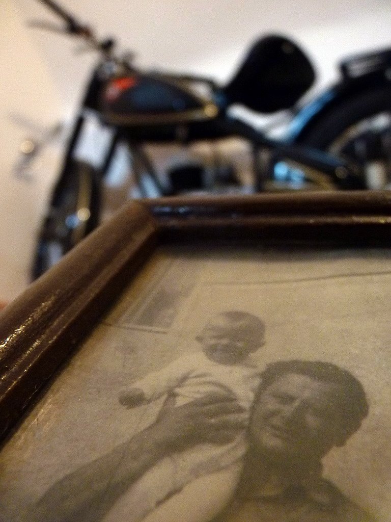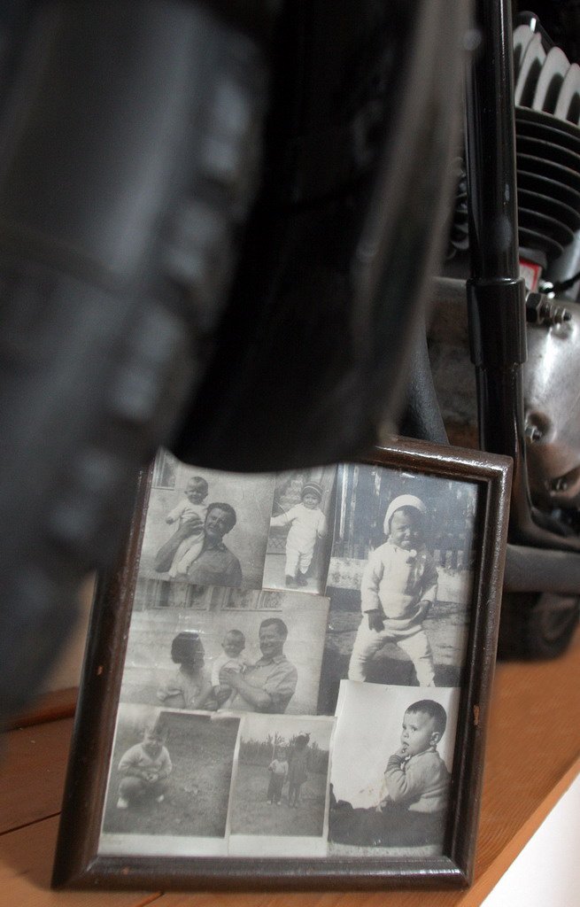 Pár évvel később falubelimnél, Farkas Lacinál, aki nagy veterános, és megláttam nála egy böcsülettel felújított 125-ös Csepelt. Nem téglavöröset ugyan, hanem feketét, de egyebekben olyat, amilyen a miénk volt. Mondta, hogy üzemképes ugyan, de papírja nincs, közlekedni tehát nem lehet vele, mire én megnyugtattam, hogy nem baj, a szobába kell. Addig rágtam a fülét, amíg eladta nekem, és amikor elhozták az édesapjával, hárman nagy fújtatva felszereltük a frissen festett falra. Két év alatt kicsöpögött belőle szép lassan az összes olaj, időnként fel kell fújni a kerekeit, meg le kell törölgetni róla a port, ennyi. Ha belépek, rátéved a pillantásom minden nap, ő képviseli a családban a távollevő apámat, mint angol királyokat a jogar.