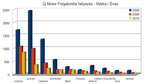 Szloboda Tamás szerint a nem regisztrációköteles robogók, quadok és krosszmotorok eladása nagyságrendileg épp annyira esett vissza, mint a rendszámos gépeké, amikről viszont pontos adatok vannak. A Datahouse összesítései szerint 2008-ban 7792 nagymotor kelt el, 2009-ben már csak 3609, az idén pedig november végéig mindössze 2220. 2009 után az idén is a Honda maradt az eladási toplista élén, ám ez kétes értékű győzelem. Azzal nyert, hogy kevesebb vevőt vesztett, mint a konkurensek. A Honda 2008-ban 1712 rendszámos motort adott el, 2009-ben 1106-ot, az idén november végéig pedig csupán 850-et.