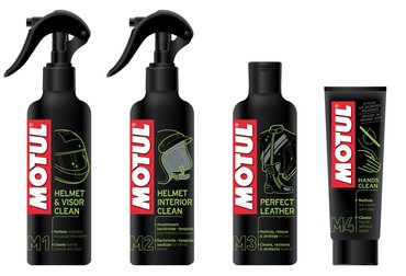 Négy új terméket kínál a Motul a motorkerékpárok és a motorosok felszereléséhez. A Perfect Leather különleges bőrtisztító és ápoló a legjobb minőségű motoros bőrruházat különösen kíméletes tisztítására és gondozására szolgál. A Helmet Exterior & Visior Clean és a Helmet Interior Clean bukósisakok és rostélyok hatékony, egyszerű tisztítására lett kifejlesztve. A Hands Clean pedig lehetővé teszi, hogy többé ne kelljen szégyenkezni a piszkos kezek miatt.