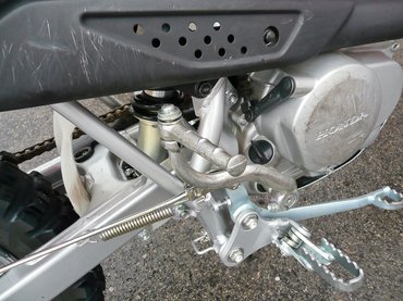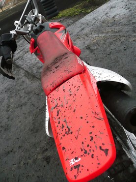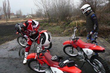 Itt minden tanfolyam céges motorokon megy, a mocsokhoz kis Honda CRF 100-as krosszmotorokat kapunk. 70 kiló körül van, a teljesítménye 15 ló körüli, amit a korábbi résztvevők keveselltek, úgyhogy kivették belőle a fojtást, megjött a hang és pont annyi pszichés lóerő, hogy azóta mindenki elégedett. Minimál sportgép, a gyújtáskulcs lent elöl, a bal oldalán, aztán átmegyünk jobbra, megnyomkodjuk a szívatót és kihajtjuk a berúgókart, aztán rugdossuk. Kicsinek kicsi, de szerencsére csak akkor mondják meg, hogy ha nem is gyerekmotor, de junior méret, amikor már megszoktuk és megszerettük.
