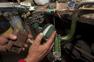 Most a nagyfeszültségű vezetékeken dolgozom. Az első kerék agyába épített áramfejlesztő táplálja a váz mellé, a kis hengerbe szerelt elemeket. Van itt egyenirányító is.