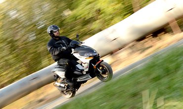 Menet közben aztán kiderül, hogy hol spóroltak leginkább a kínaiak. A sportos külső csak illúzió: a gép műszaki szempontból teljesen átlagos kétütemű ötvenes. A kipufogó csak formájában hasonlít a rezonátoros sportrendszerekre – legalábbis a motor karakterében nyoma sincs hirtelen teljesítménynövekedésnek. Végig egyenletesen húz, és nem is kiugróan erős: a sebességmérőt 62 km/h-ig sikerült feltornászni sík úton, ennél többet csak lejtőn mutatott a műszer.