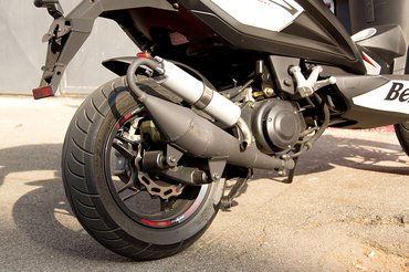 Ahogy a tesztrobogó előkerült a raktárból, kiderült, hogy a Benelli nem csak képeken mutat jól. Rendesen teleszórták mindennel, amit egy korszerű robogótól elvárna az ember: vannak a hullámos féktárcsák aranysárgára eloxált féknyergekkel, rezonátoros kipufogórendszer, LCD műszerek digitális sebességmérővel, és persze a ma divatos űrhajóformák mindenütt. Ráadásul a részletek kidolgozása sem tűnik elnagyoltnak: legalább átlagos minőségű tárgy benyomását kelti. Nem hasonlítanám a japán robogókhoz, de látványos hibákat nem fedeztem fel rajta.
