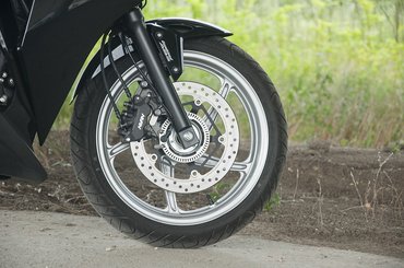 A motor mérsékelt teljesítményéről a fékek is árulkodnak: a 290 milliméter átmérőjű tányérok csipkézettek, messziről azt is rájuk foghatnánk, hogy hullámosított szélűek. Van fékerő: nem gyűri meg a földkérget, de ennyi erővel elboldogul. A 37 milliméteres villa is a spórolás jegyében született – az olaszok ilyet nem mernének feltenni egy sportosnak szánt gépre, de Japánban ez is megfelel, és lássuk be, Magyarországon is. Ezzel úgysem fog pályázni senki.